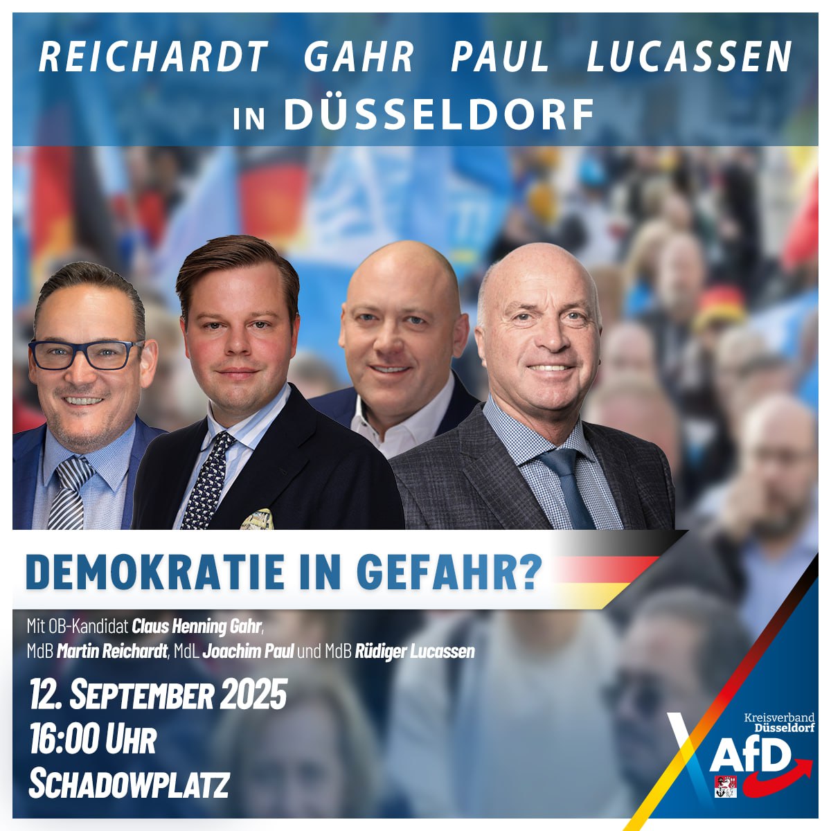 Kommen Sie am 12.09.2025 auf den Düsseldorfer Schadowplatz zur großen AfD Wahlkampfkundgebung im Rahmen der Kommunalwahlen in Düsseldorf und ganz NRW. Überzeugen Sie sich aus erster Hand von der AfD, treffen Sie Gleichgesinnte und tauschen Sie sich mit ihren Mitbürgern aus. Ab 16 Uhr werden Sie auf unseren Düsseldorfer AfD Oberbürgermeisterkandidaten, Claus Henning Gahr, die AfD Bundestagsabgeordneten Martin Reichardt und Rüdiger Lucassen sowie den verhinderten OB Kandidaten für Ludwigshafen, Joachim Paul, treffen.