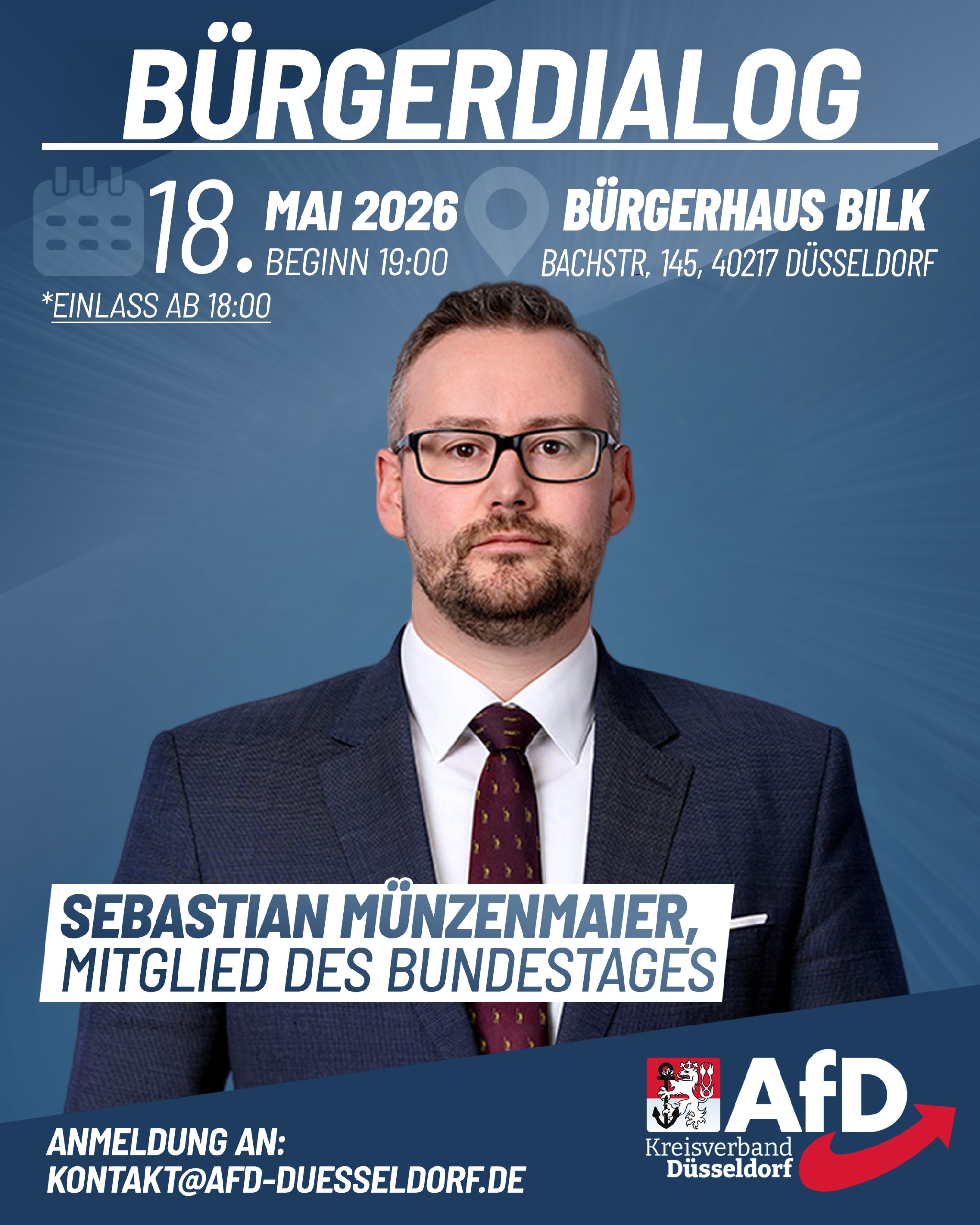 Am 18.05.2026 lädt die AfD Düsseldorf zu einem Bürgerdialog mit dem politischen Schwergewicht Sebastian Münzenmaier MdB ein . Sebastian Münzenmaier ist stellvertretender Vorsitzender der AfD-Bundestagsfraktion und darüber hinaus stellvertretender Landessprecher der AfD Rheinland-Pfalz.