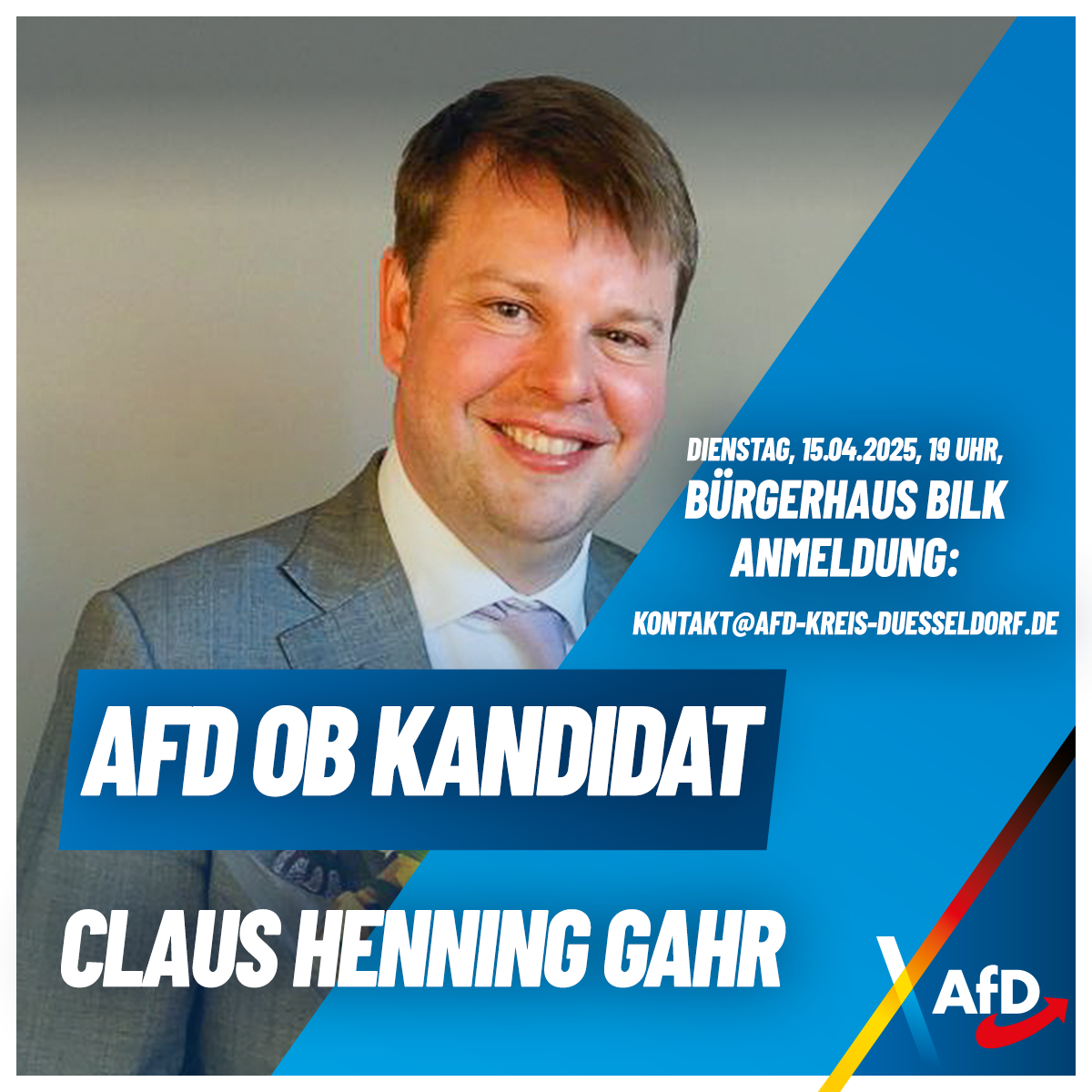 Startschuss für unseren Wahlkampf ist der 15.04.2025: Unser AfD OB Kandidat Claus Henning Gahr wird sich interessierten Parteifreunden sowie den Düsseldorfer Mitbürgern im Bürgerhaus Bilk vorstellen. Ab 19 Uhr wird er zusammen mit Sven Tritschler, dem stellv. Landessprecher und kommunalpolitischen Sprecher der AfD Fraktion NRW, Rede und Antwort stehen. Zudem erwarten wir an diesem Abend den AfD OB Kandidaten von Duisburg, Carsten Groß. Unser Kommunalwahlprogramm wird öffentlich.